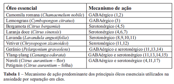 Como não existe muita literatura de aromaterapia aplicada na medicina veterinária, o uso dos óleos essenciais se baseia em pesquisas realizadas com humanos e roedores. O Dr. Guilherme disponibilizou uma tabela (abaixo) com os óleos essenciais utilizados por ele no controle da ansiedade. Ele também fala que alguns óleos não tem estudos na ansiedade, mas “sua utilização é baseada em evidências científicas acerca dos componentes majoritários destes óleos em modelos animais de ansiedade utilizando roedores”.